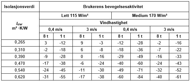 Tabellen gir kun en indikasjon. Plaggets evne til å isolere mot kulde påvirkes også betydelig av faktorer som brukerens fysikk, helse og andre forutsetninger.